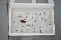After the butterflies have emerged, the box is stained with red meconium that each insect has evacuated after coming out of the chrysalis (pupa).