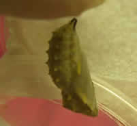 The pupa will have hung itself from the paper towell. You pull the paper towell from the container and pin it into a small flight cage, about three inches from the bottom. It is high enough for the butterfly to spread its wings completely and dry them when it emerges. If the pupa is pinned too high in the cage, the butterfly could fall and destroy itself. If the emerging butterfly falls from its chrysalis, it must be able to crawl up again in a hurry to dry its wing, so your flight cage must have ruff wall for it to crawl up. Slippery plactic or glass containers will not do the trick unless tou add a wooden branch or something.