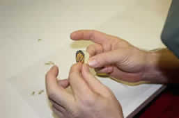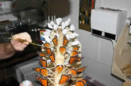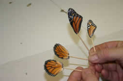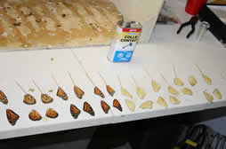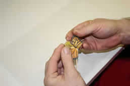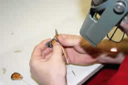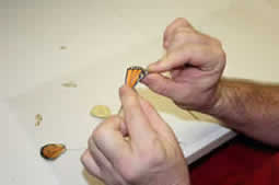 trempe l'extrémité dans la résine pour les placer un à un sur chaque aile.