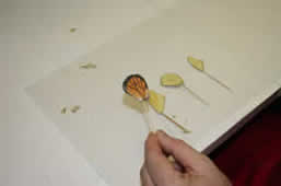 collées aux cure-dents, sur la tige de styromousse et j'enduis le bord de