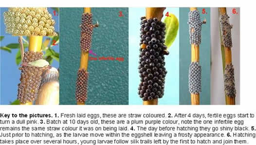 Clefs des photos. 1.Oeufs fraichement pondus. 2. Après 4 jours, les oeufs fertiles commencent à prendre une teinte rose terne. 3. Lots après 10 jours, ceux-ci sont couleur de prune, remarquez l'oeuf infertile qu ia gardez sa couleur paille d'origine. 4. Le jour avant l'éclosion ils deviennent noir luisant. 5. Just avant l'éclosion, le mouvement de la chenille à l'intérieur de la coquille laisse une apparence givrée. 6. Les éclosions se produisent durand plusieurs heures, les jeunes larves suivent les fils de soie laisser par les premières larves et les rejoignent.