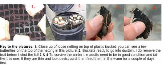 Clefs des photos. 1. Gros plan du filet à grosses mailles couvrant le dessus des sceaux de plastique, vous pouvez voir quelques papillons au travers des mailles sur cette photo. 2. Des sceaux prêts à être introduits dans le conteneur, je retire les fruits avant de fermer le couvercle! 3&4. Pour survivre à l'hiver les adultes ont besoins d'être dodus et en bonne condition comme celui-ci. Si ils sont maigres et ont l'apparence chétive, alors nourrissez-les au chaud pendant quelques jours.